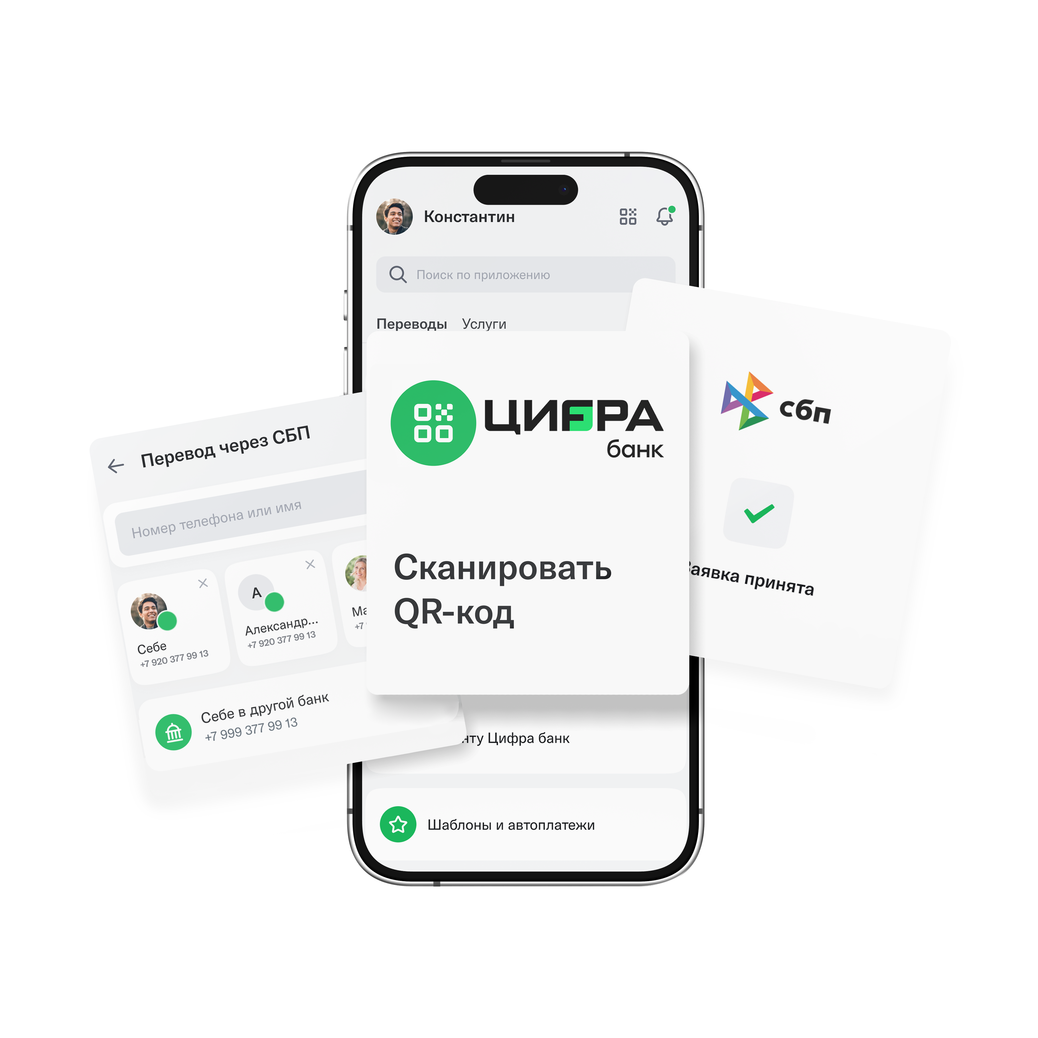 - Войдите в интернет-банк или мобильное приложение «Цифра банк» в раздел «Платежи и переводы», выберите функцию «Перевод по СБП».